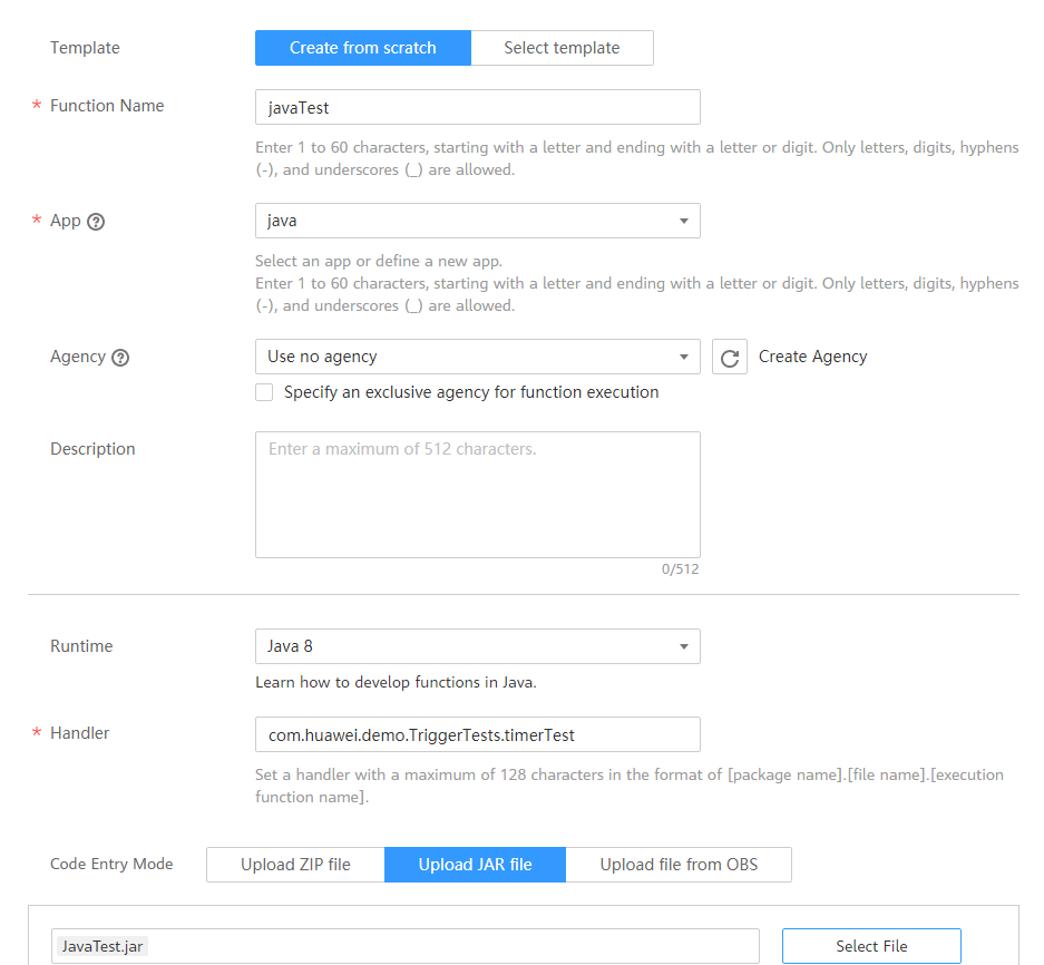 - Log in to the FunctionGraph console, create a Java function, and upload the JAR file, as shown in Figure 10.