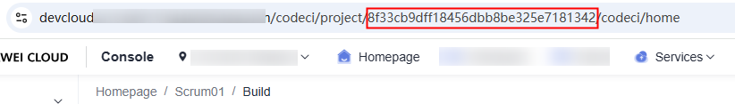 - Go to the specified project. As shown in Figure 1, the information in the red box indicates the CodeArts project ID.