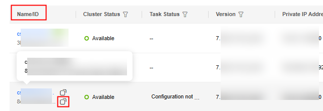- In the cluster list, find the cluster and copy the cluster ID in the Name/ID column.