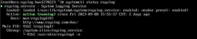 Figure 2 Checking the rsyslog statusRun systemctl status rsyslog to check whether the rsyslog running status is running.