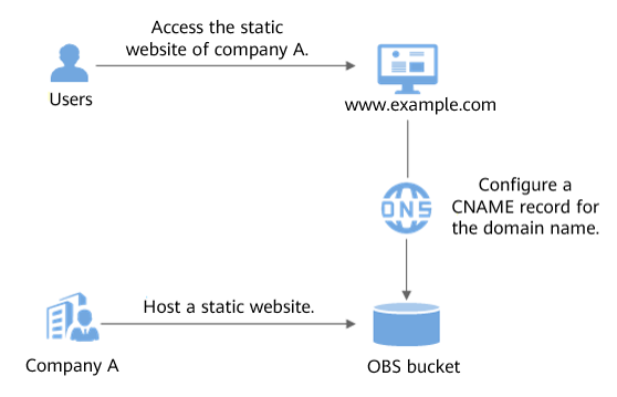 A company has a large number of static websites for users to access, but does not want to set up servers. In this case, this company can host its static websites in an OBS bucket, so that users can access the hosted static websites using the domain name bound to the OBS bucket.