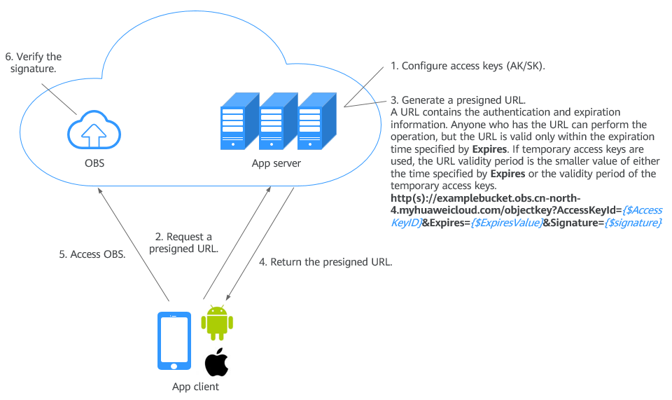 Access keys (AK and SK) are not required for accessing OBS from Android or iOS apps. But a presigned URL must be obtained from the app server before accessing OBS, and required information must be carried in the URL, including the request type, resource path, and resource name. For example, an upload request needs to indicate that the URL is for uploading data. In the URL, the upload path and object name are specified. Similarly, a URL for downloading data should contain the name of the object to be downloaded.