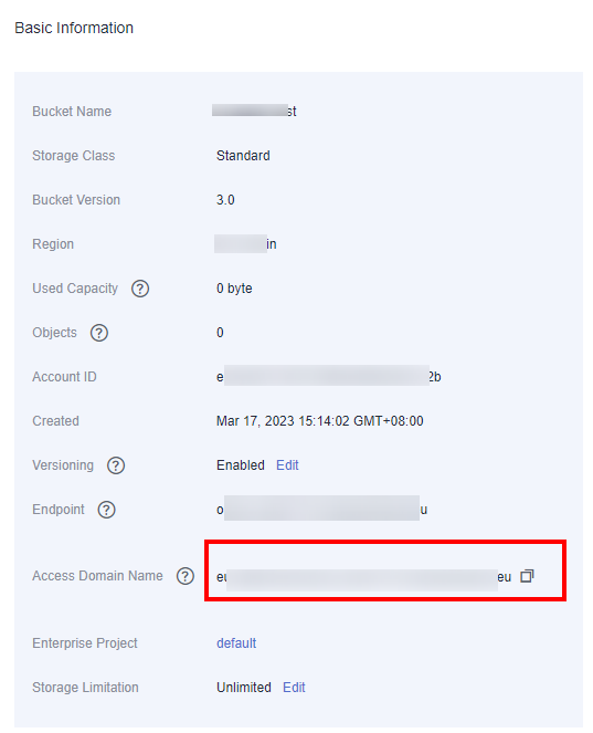 In the bucket list, click the bucket you want to go to the Objects page. In the navigation pane, click Overview. In the Basic Information area, view the access domain name of the bucket.