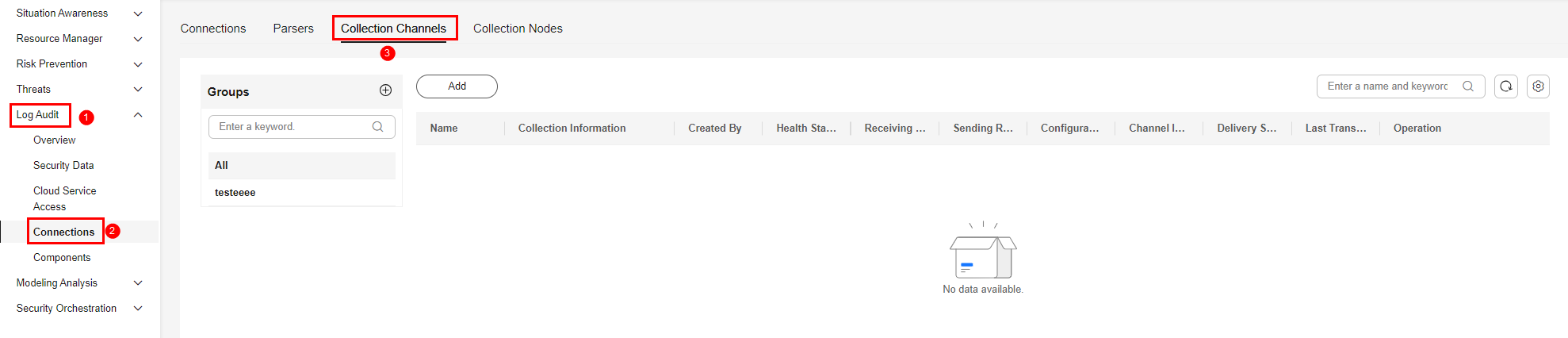 4. In the navigation pane on the left, choose Log Audit > Collections. Then, select the Collection Channels tab.