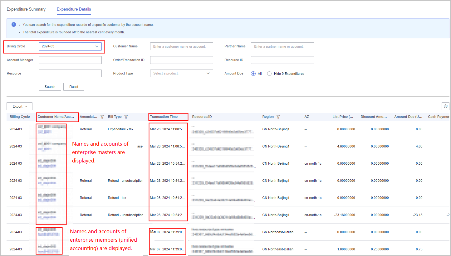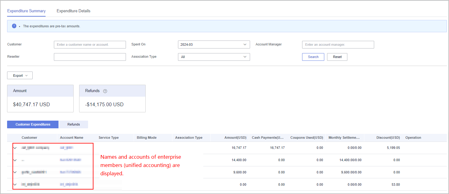 If the customer disassociated from you at 15:25:30 on March 14, 2024, details of expenditures generated from 00:00:00 on March 1, 2024 to 15:25:30 on March 14, 2024 are displayed with the account name of the customer. Details of expenditures generated from 15:25:31 on March 14, 2024 to 23:59:59 on March 31, 2024 are included in those of the customer's enterprise master.