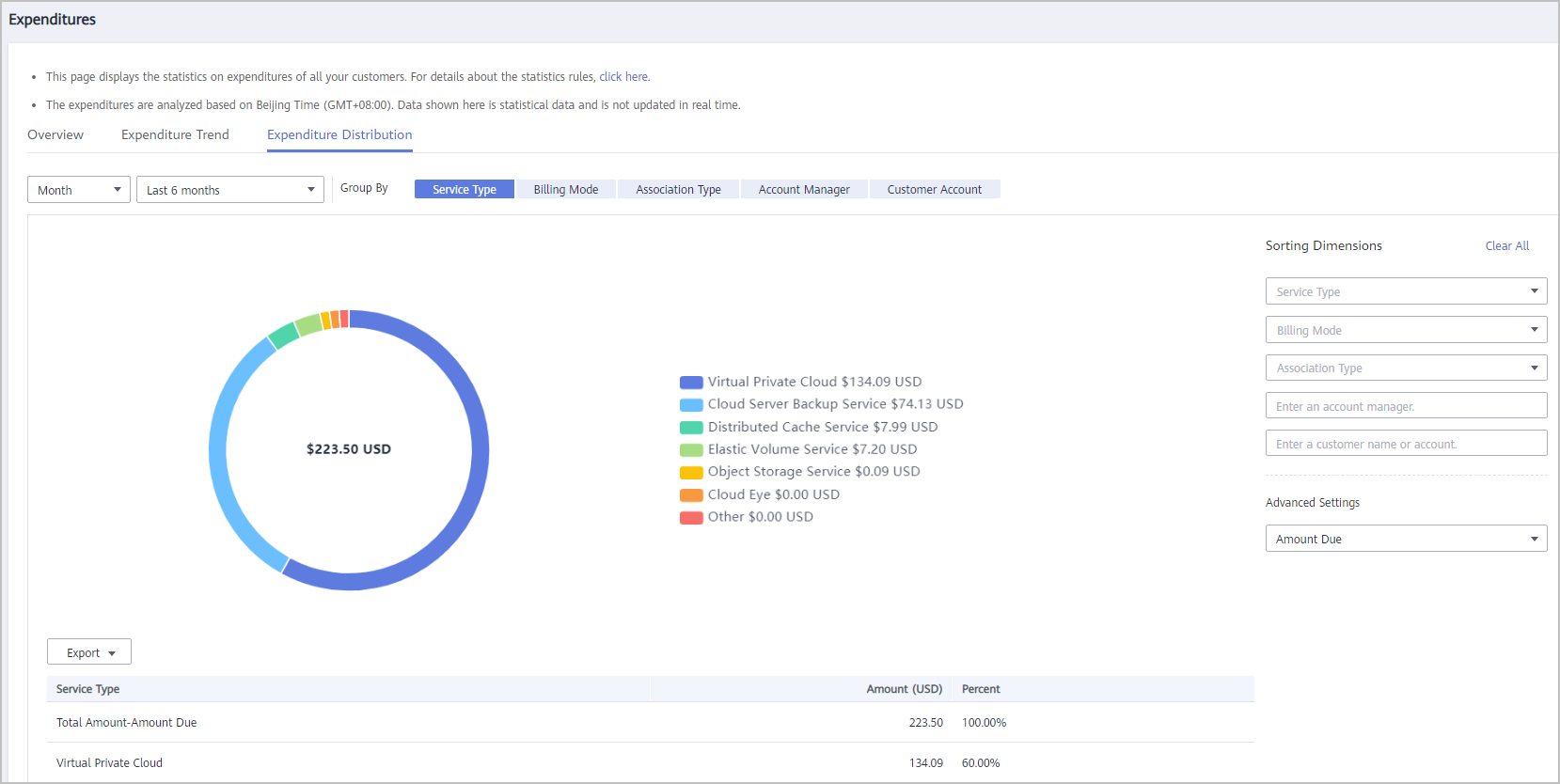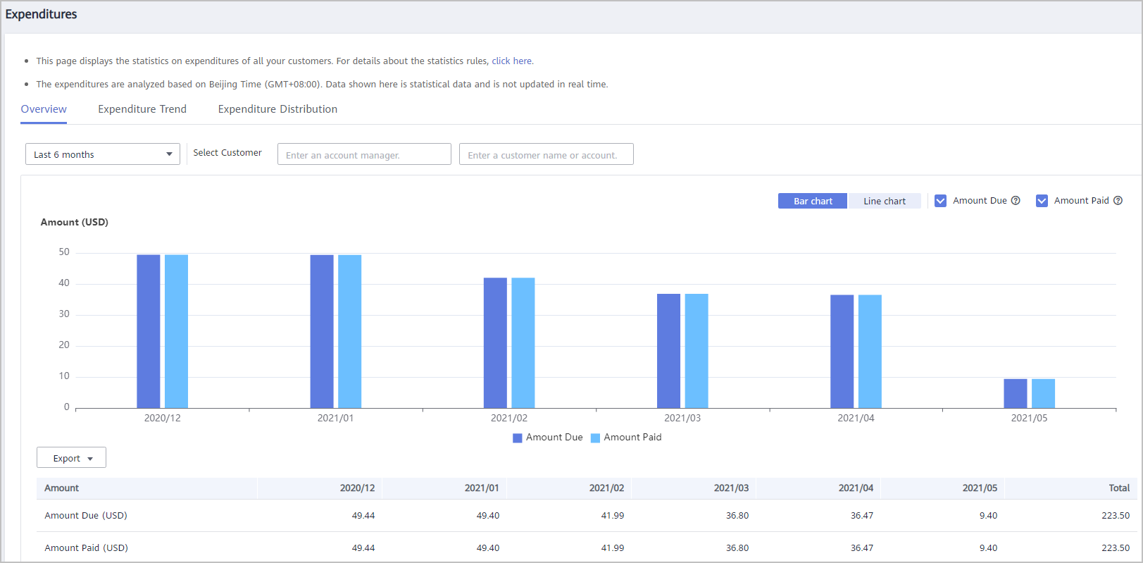 - You can view more detailed expenditure data on the Expenditure Distribution tab of the Sales > Operations Statistics > Expenditures page. You can specify a time period and a customer to view expenditures.