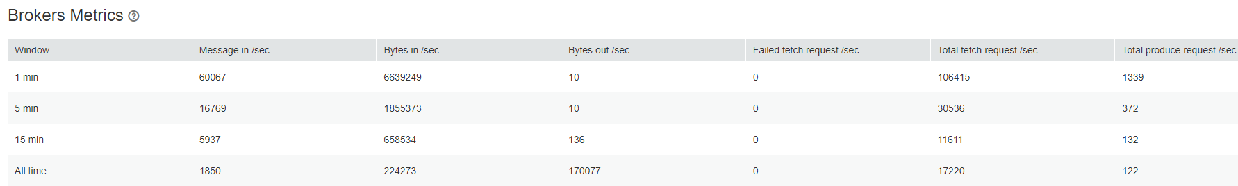 - In the Brokers Metrics area, you can view the JMX metrics of the broker node data traffic, including the average number of incoming messages per second, number of bytes of incoming messages per second, number of bytes of outgoing messages per second, and number of failed requests per second, total number of requests per second, and number of production requests per second in different time windows.