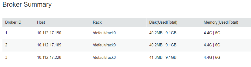 - In the Broker Summary area, you can view Broker ID, Host, Rack, Disk(Used|Total), and Memory(Used|Total) of brokers.