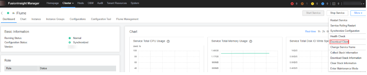 Log in to the FusionInsight Manager. Choose Cluster > Name of the target cluster > Services > Flume. On the Flume service page that is displayed, choose More > Download Client in the upper right corner and set Select Client Type to Complete Client to download the Flume service client file.