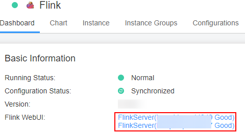 - On the right of Flink WebUI, click the link to access the Flink web UI.