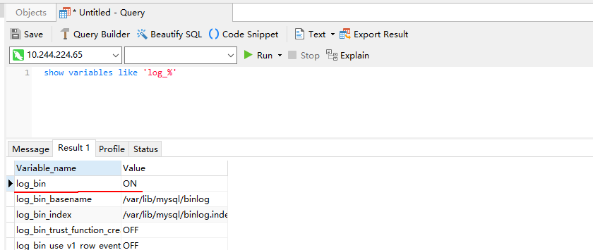 For example, in Navicat, choose File > New Query to create a query, enter the following SQL statement, and click Run. If log_bin is displayed as ON in the result, the function is enabled successfully.