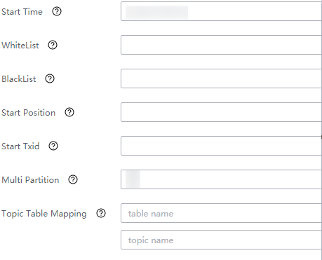 - Topic Table Mapping: In the first text box, enter a topic name (the value must be different from that of Name in 4), for example, myclass_topic. In the second text box, enter a table name, for example, myclass. The value must be in one-to-one relationship with the topic name entered in the first text box.)