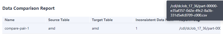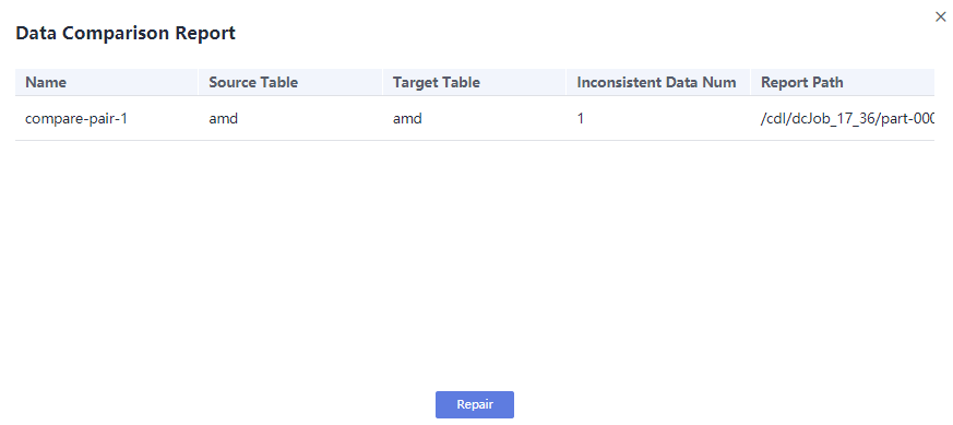 • Currently, only the data captured from PgSQL to Hudi can be compared. If the comparison result is inconsistent, a report address is generated only when there are no more than 2000 inconsistent data records. If there are more than 2000 inconsistent data records, no report address is generated and data cannot be repaired.