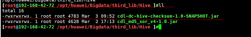 1. You have prepared the Hive UDF JAR package, copied ${BIGDATA_HOME}/FusionInsight_CDL_*/install/FusionInsight-CDL-*/cdl/hive-checksum/cdl-dc-hive-checksum-*.jar from the CDL installation directory to the ${BIGDATA_HOME}/third_lib/Hive directory of Hive, and set the permission on the JAR package to 750 or higher.