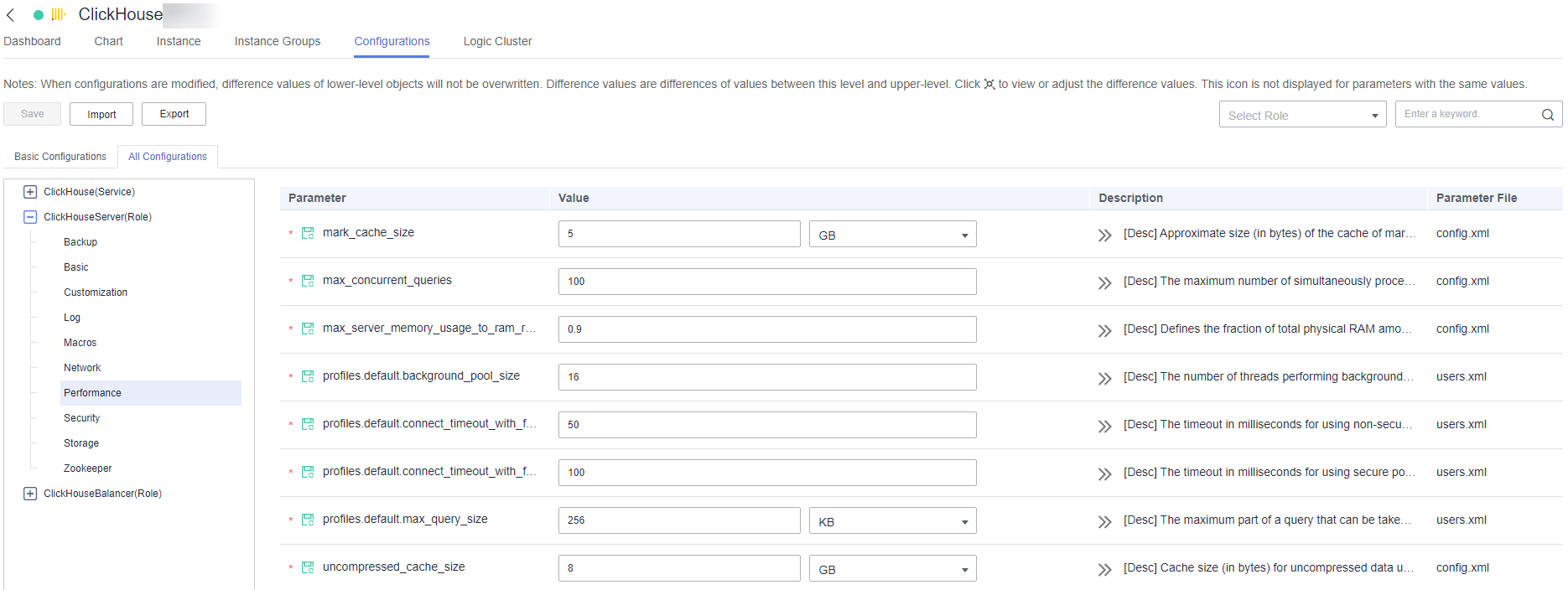- Log in to FusionInsight Manager and choose Cluster > Services > ClickHouse. Click Configuration then All Configurations, click ClickHouseServer(Role), and select Performance.