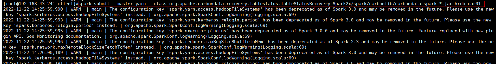 spark-submit --master yarn --class org.apache.carbondata.recovery.tablestatus.TableStatusRecovery Spark/spark/carbonlib/carbondata-spark_*.jar hrdb car01