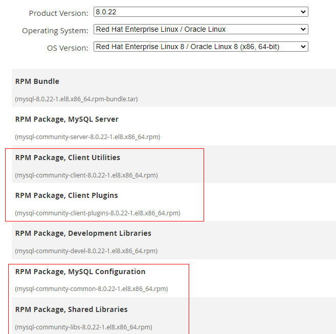 For example, to install the MySQL 8.0.22 client of Red Hat, download the following software packages: