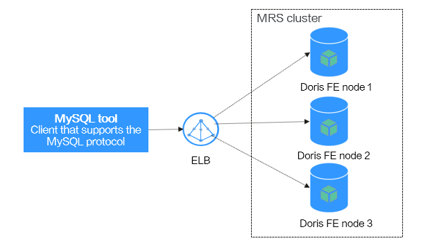 Doris can use a client that supports the MySQL protocol to access a single FE node to perform service operations. If FE nodes are faulty, Doris cannot provide services for external systems. To solve this problem, MRS can be deployed with the Elastic Load Balance (ELB) service in the architecture shown in Figure 1.