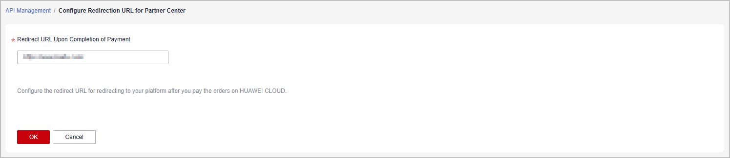 After the access configuration is complete, partners can configure the redirection URL on the API Management page so that customers can return to the partner sales platform after paying for an order.