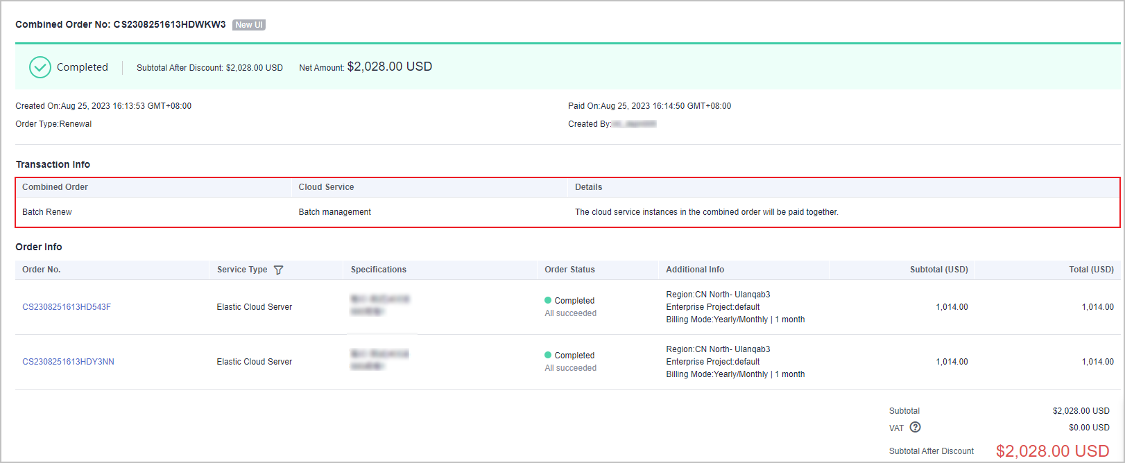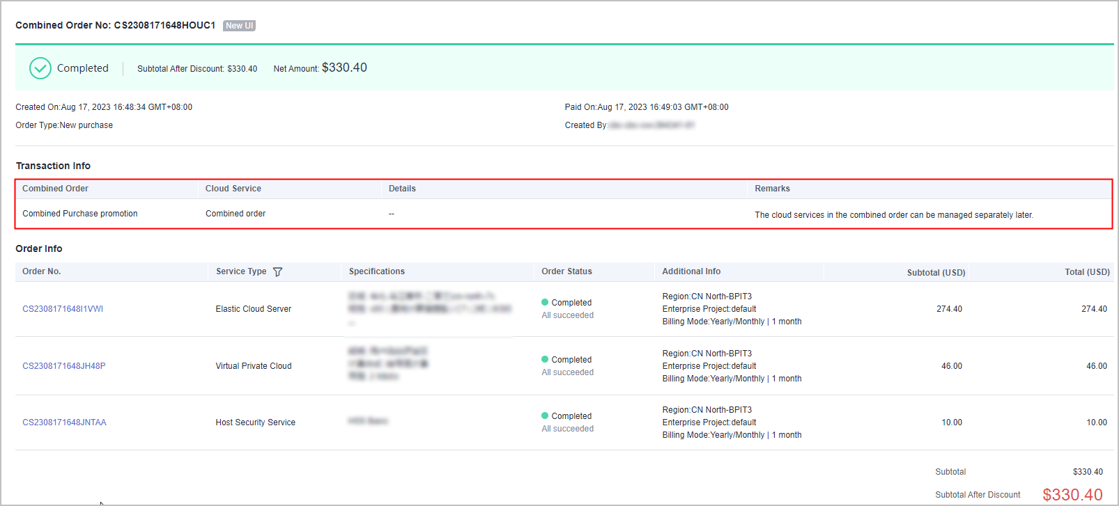 A combined order is generated when you place multiple instances in one order for batch purchase, renewals, specification changes, unsubscriptions, and billing mode changes from pay-per-use to yearly/monthly. In the combined order, all instances must be paid or canceled together. After the combined order is paid, these instances can be managed separately.