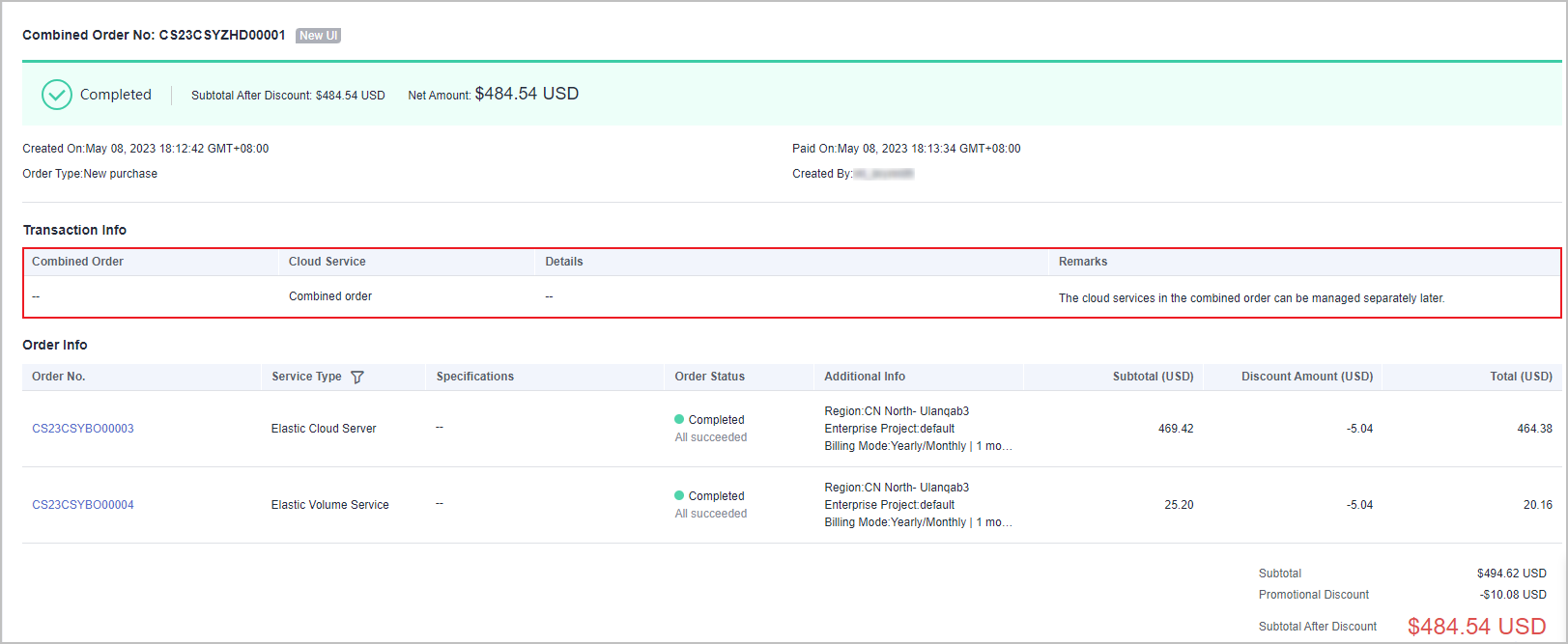 You can view the combined order details, such as the order name and combination type, on the Billing Center.