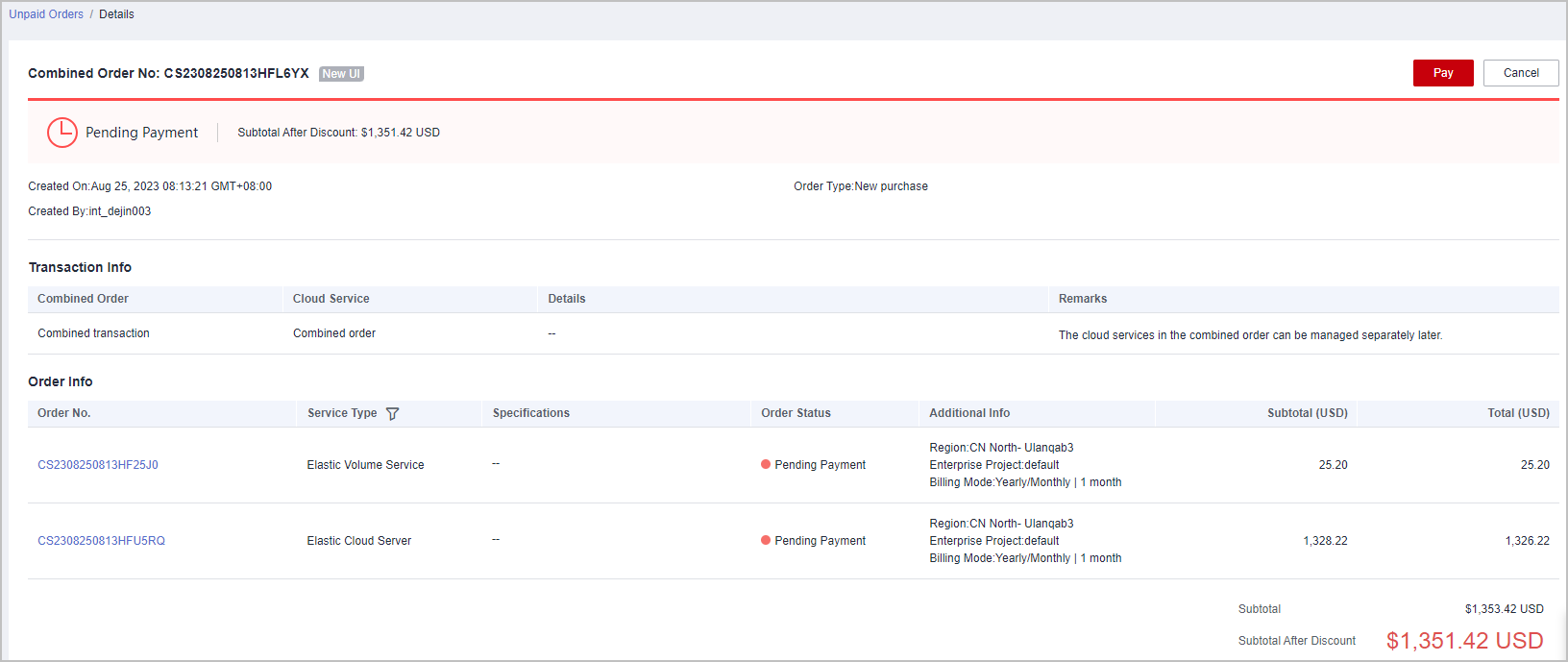 A combined service consists of multiple resources and is purchased as a whole. The resources in a combined service must be purchased, used, renewed, changed, unsubscribed from, frozen, unfrozen, deleted, and billed together. A combined order includes multiple instances for batch management. The instances in a combined order must be paid or canceled together.