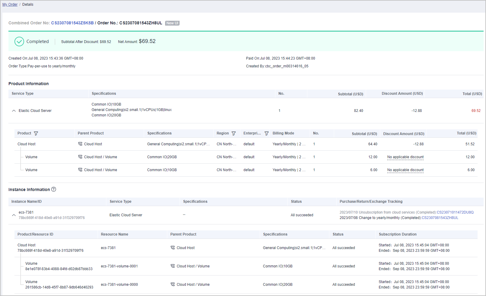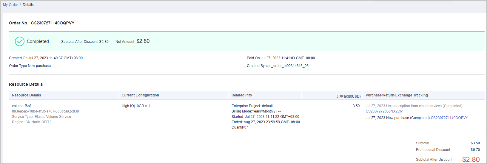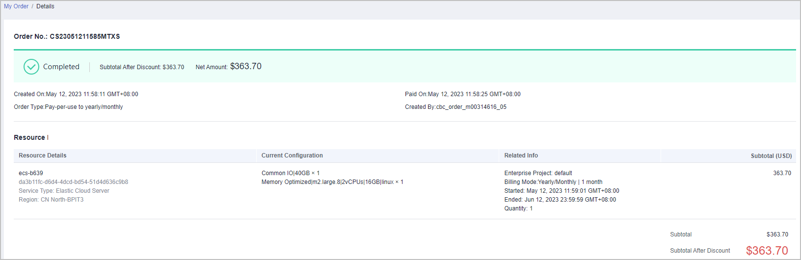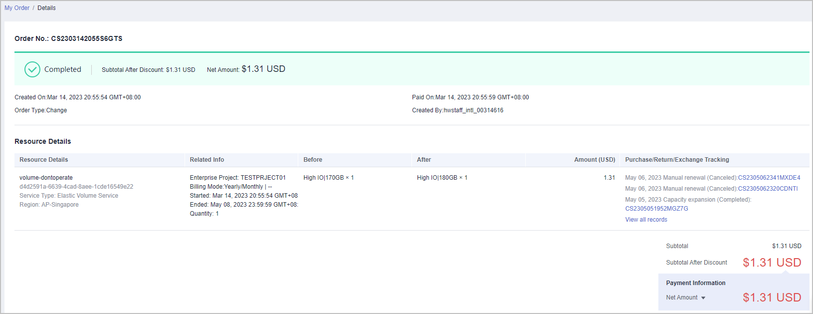 • Original order details of changing the billing mode from Pay-Per-Use to Yearly/Monthly: