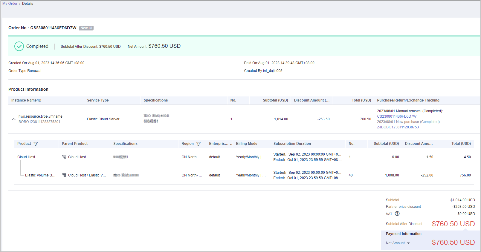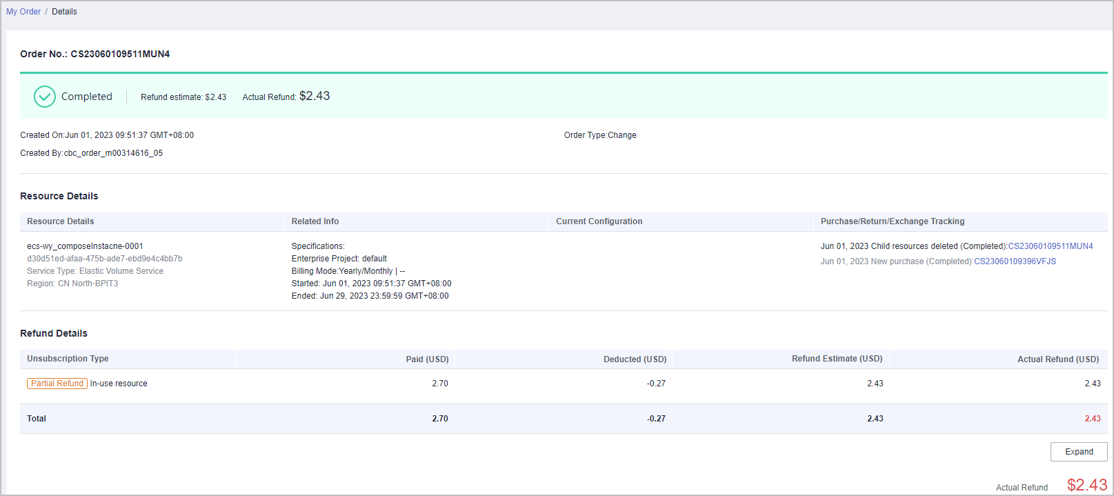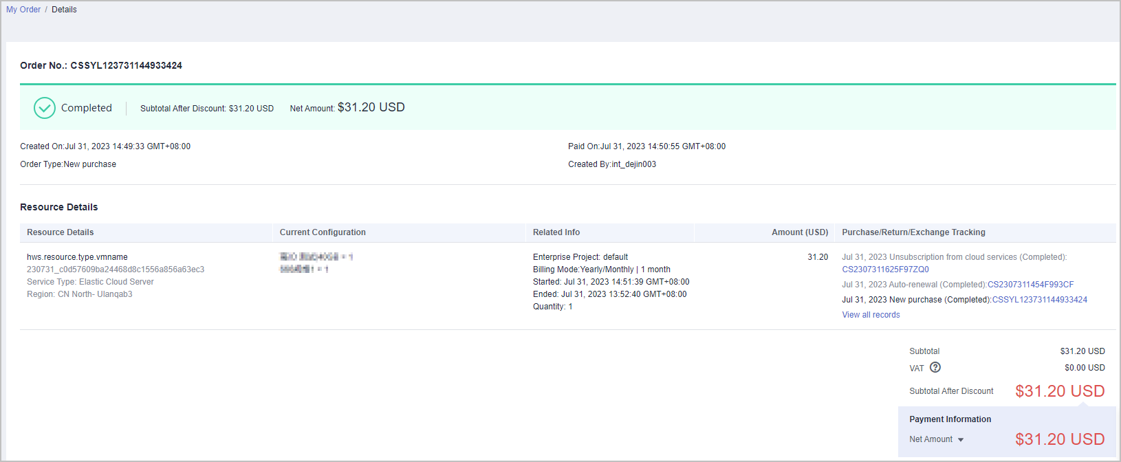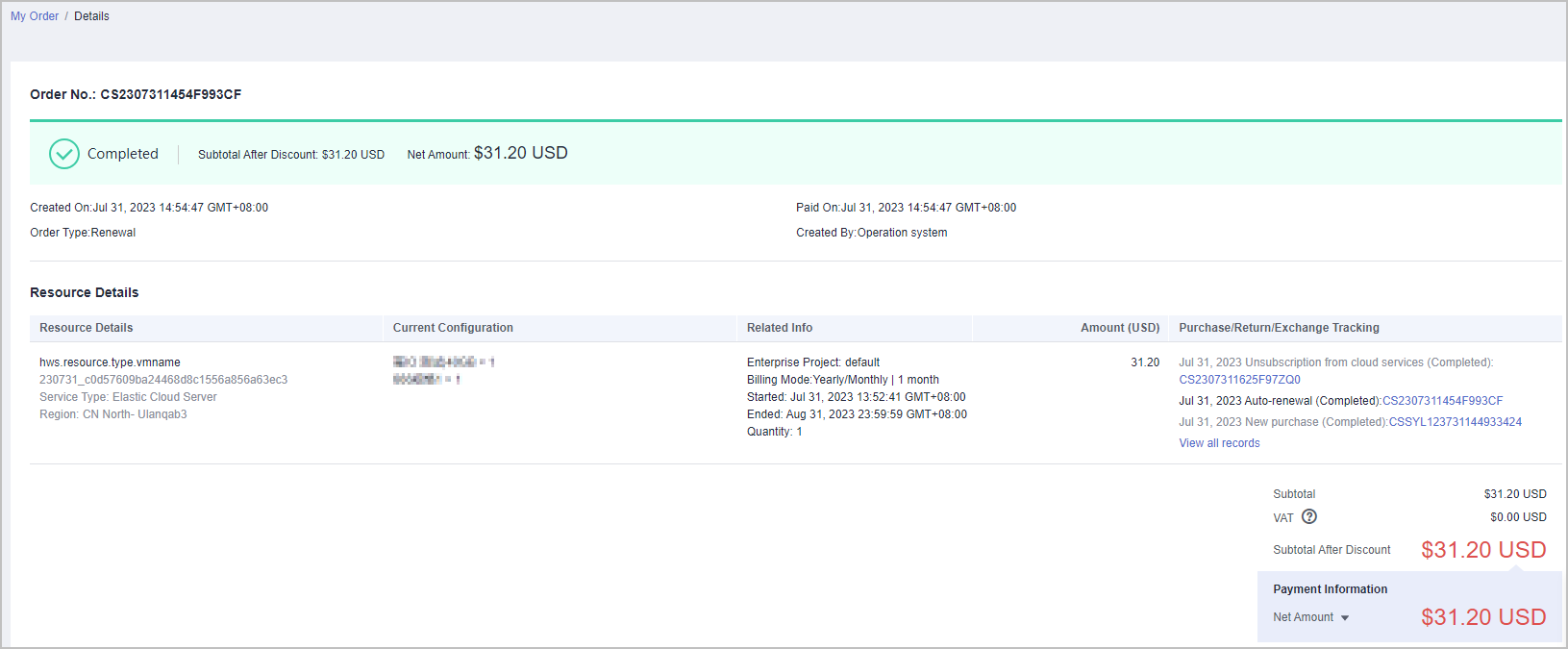 • Original order details of changing the billing mode from Pay-Per-Use to Yearly/Monthly: