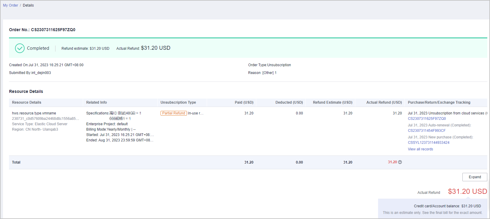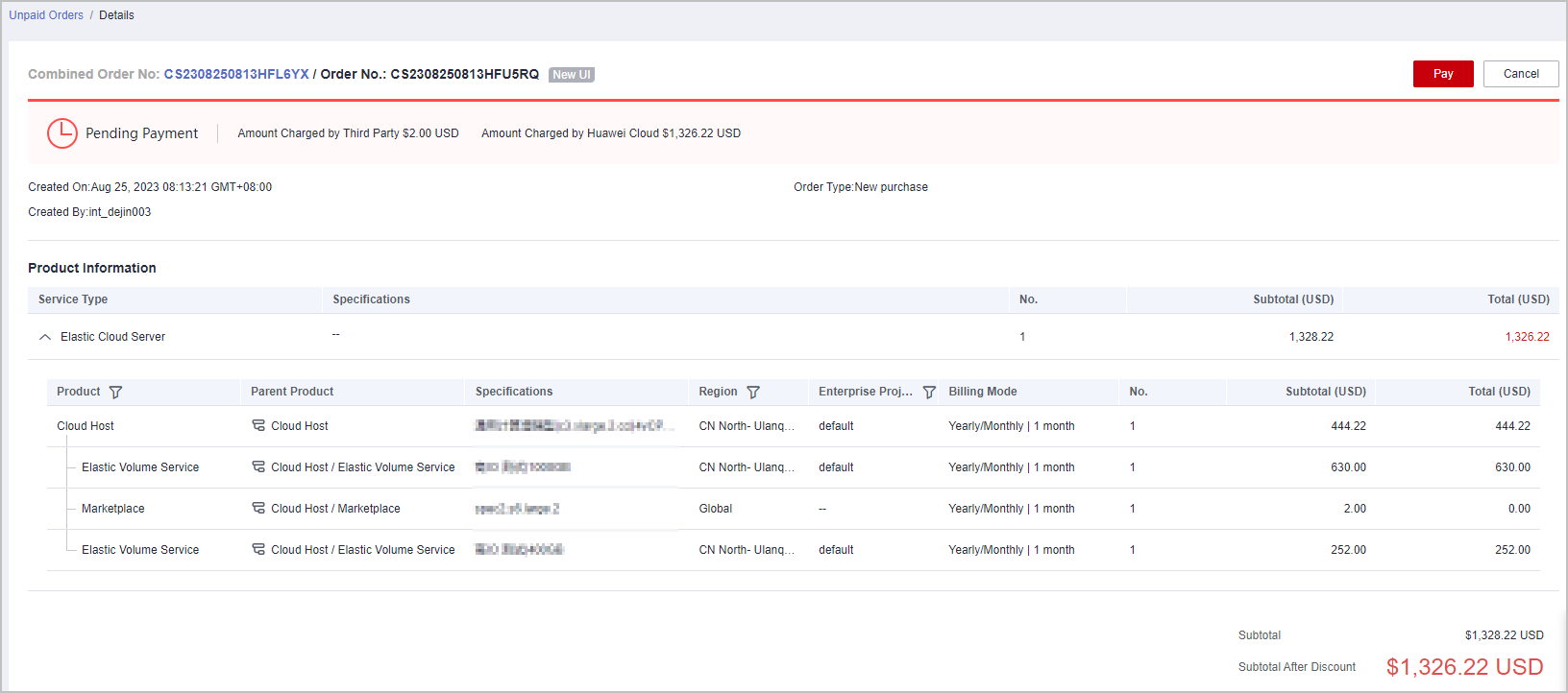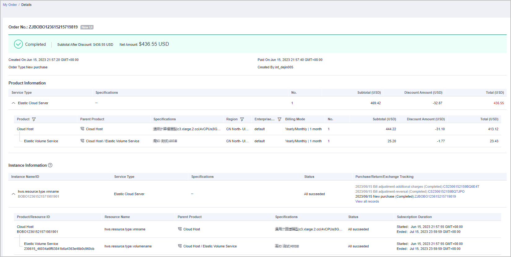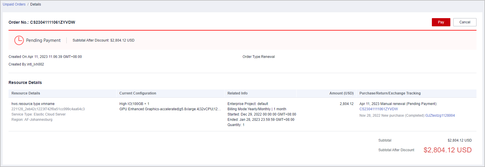 • Original order details of changing the billing mode from Pay-Per-Use to Yearly/Monthly: