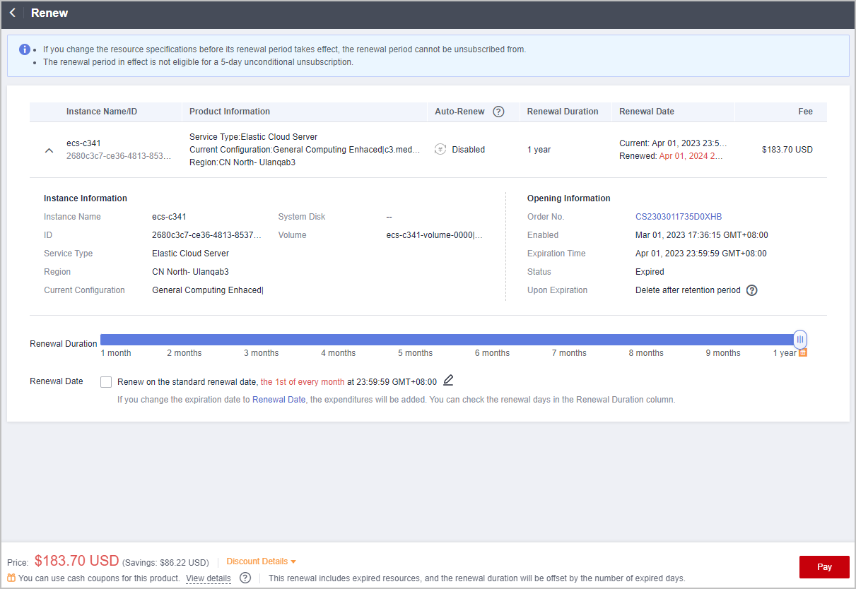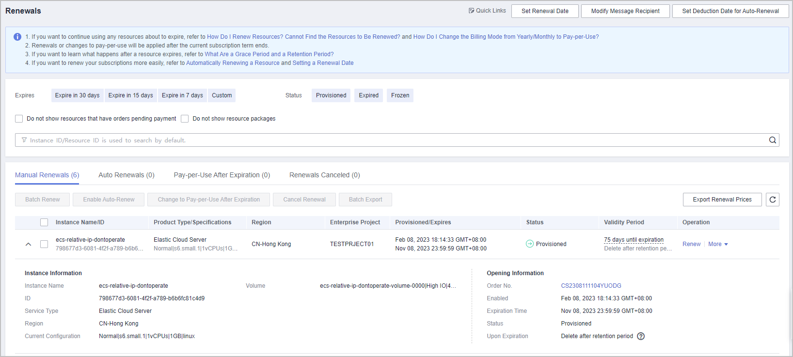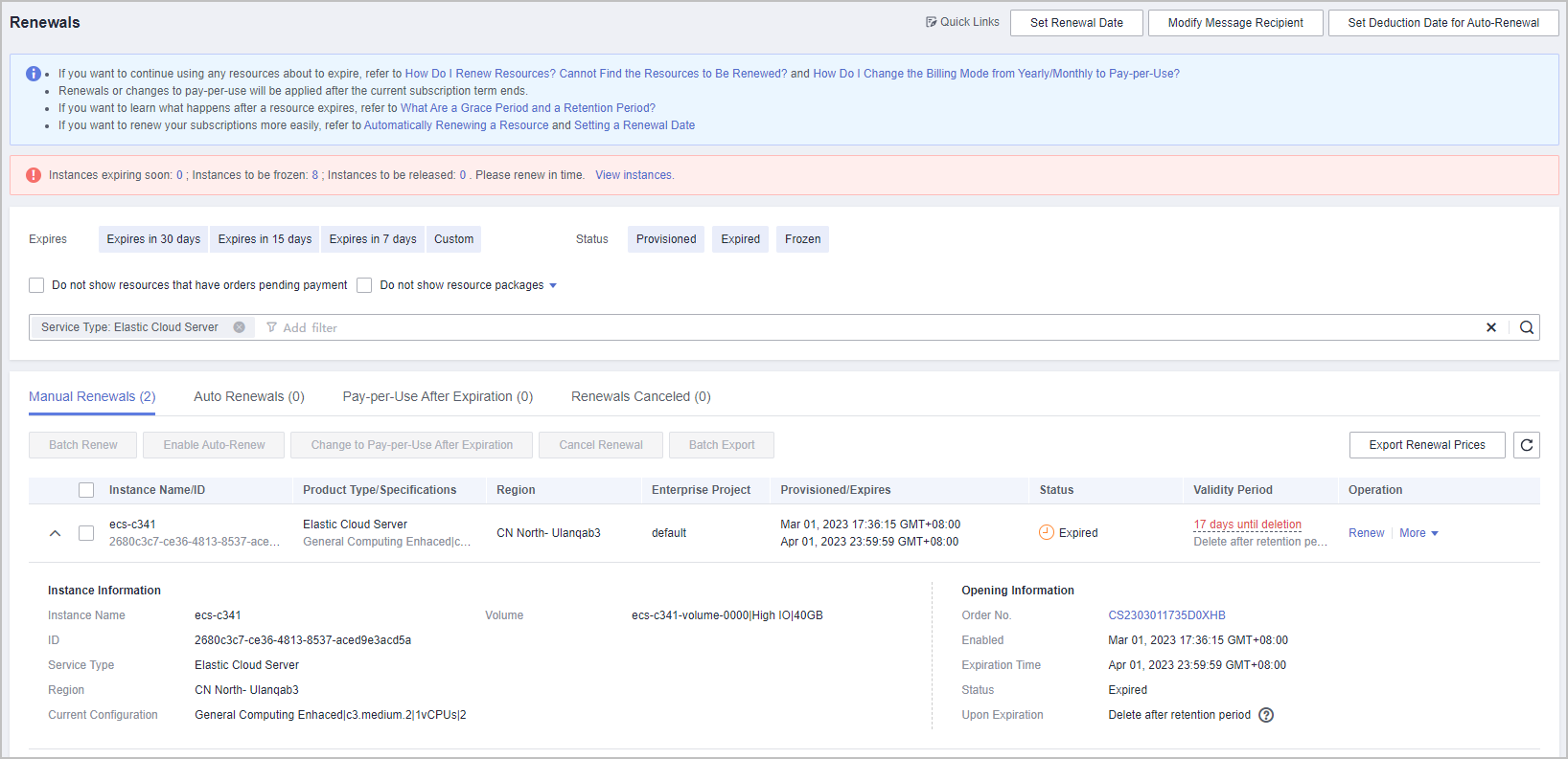 If Huawei Cloud freezes or deletes any resources in the combined service due to arrears or expiration, the combined service, that is the instance, is taken as a whole to be frozen or deleted. After all the resources in the combined service are paid or renewed, the whole instance is unfrozen.