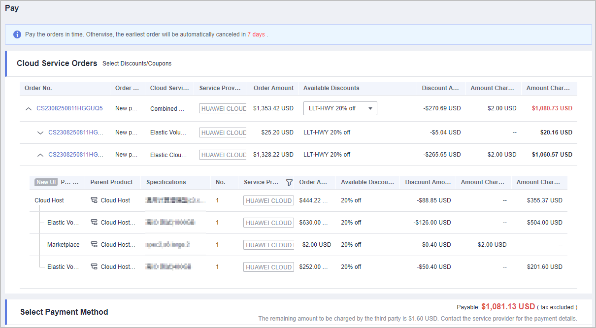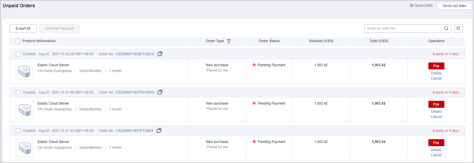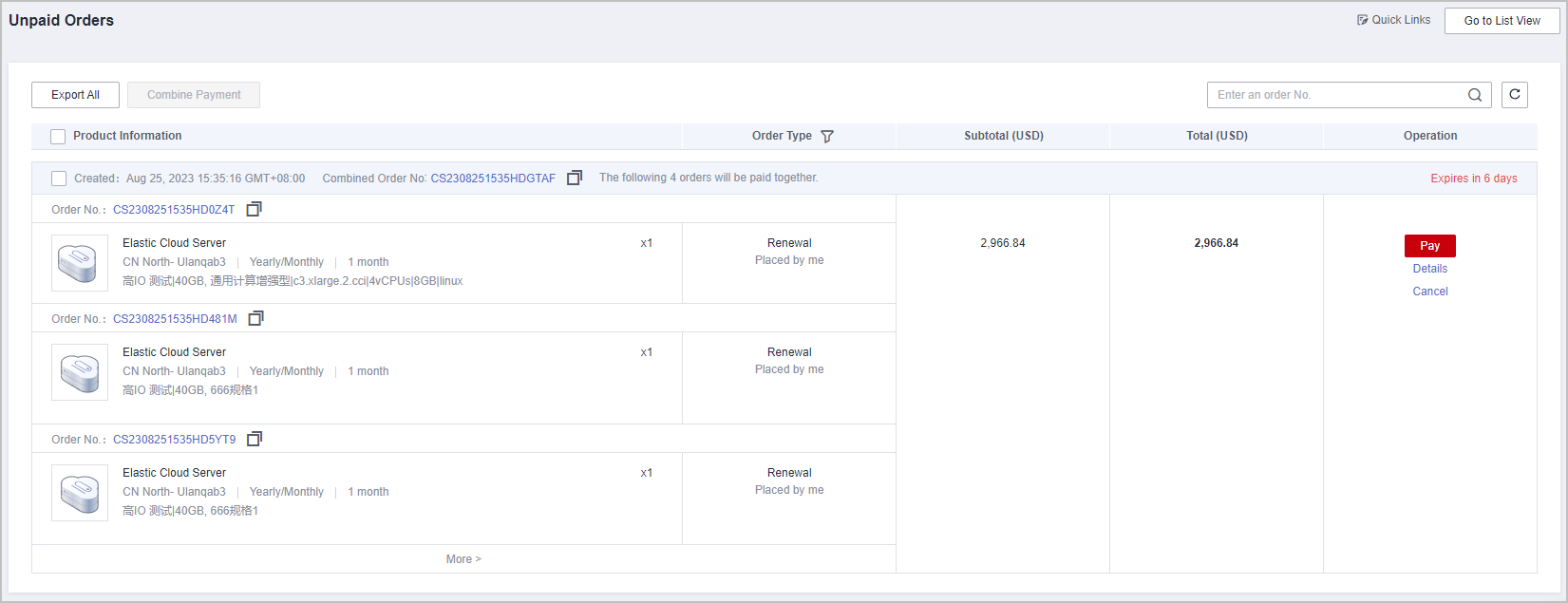 • You can expand a combined order to view the order details. If the combined order includes a combined service, you can also expand the orders to see their discounts, expenditures, and the resource relationship in a combined service.