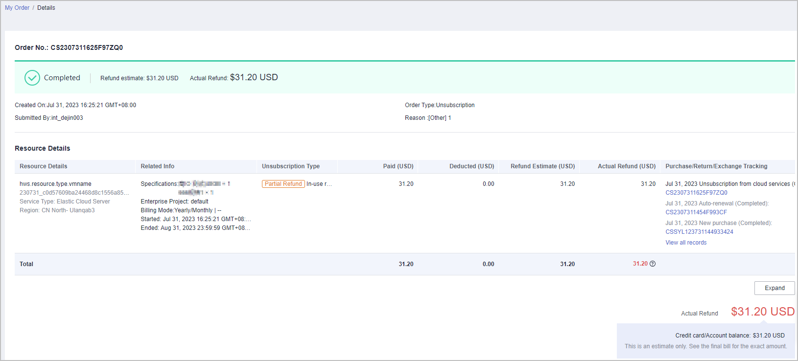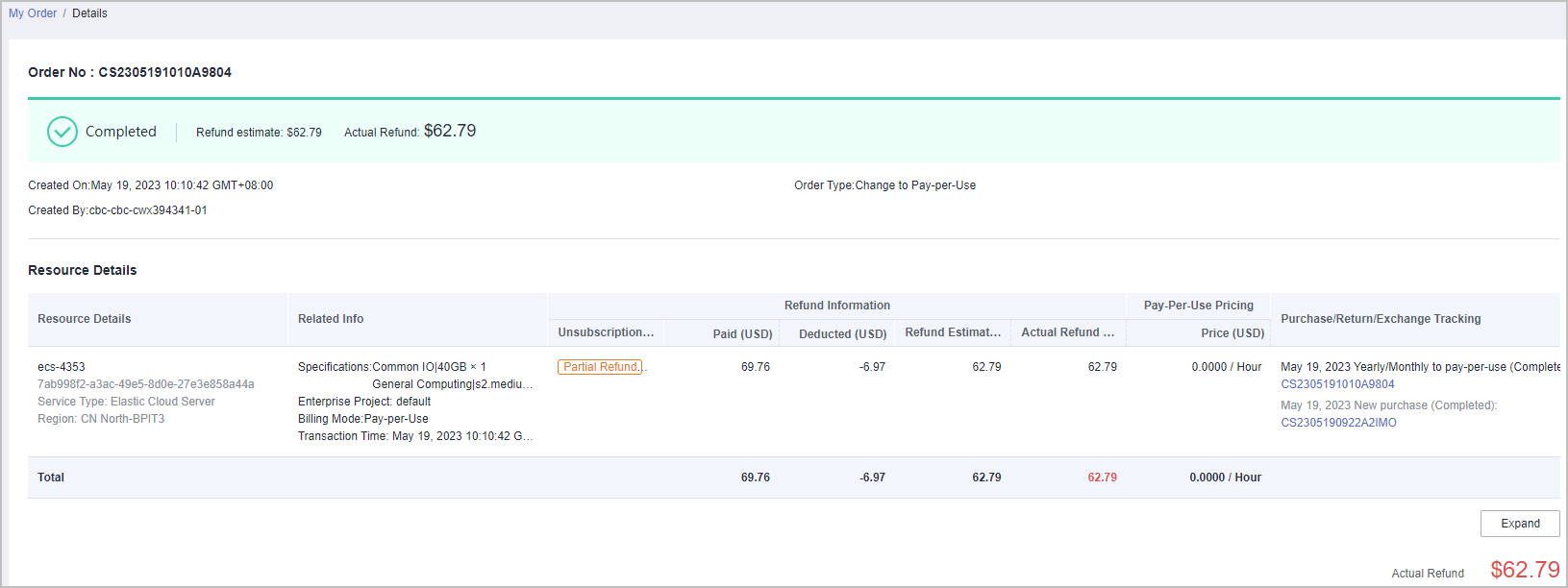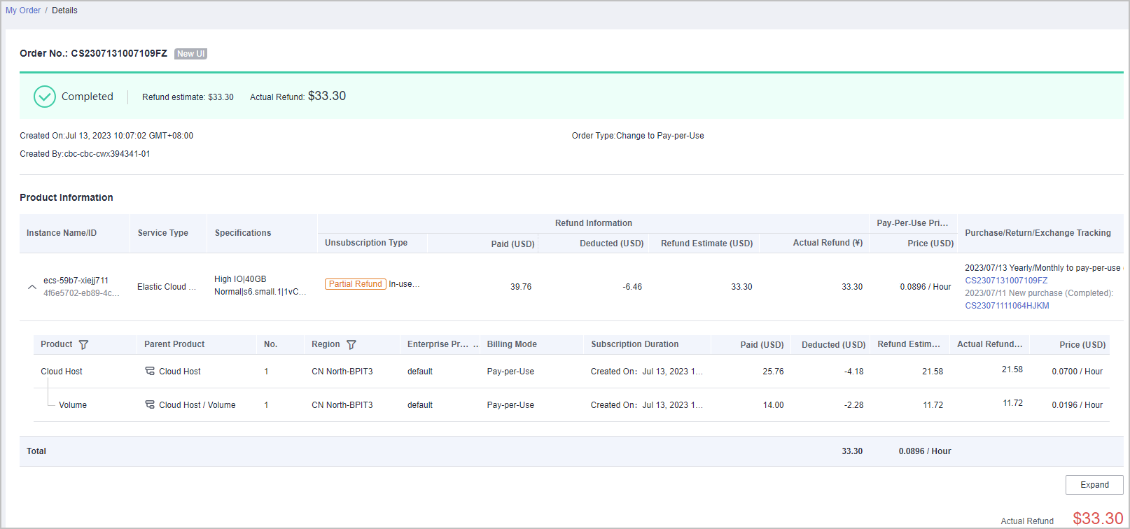 • Original order details of changing the billing mode from Yearly/Monthly to Pay-Per-Use:
