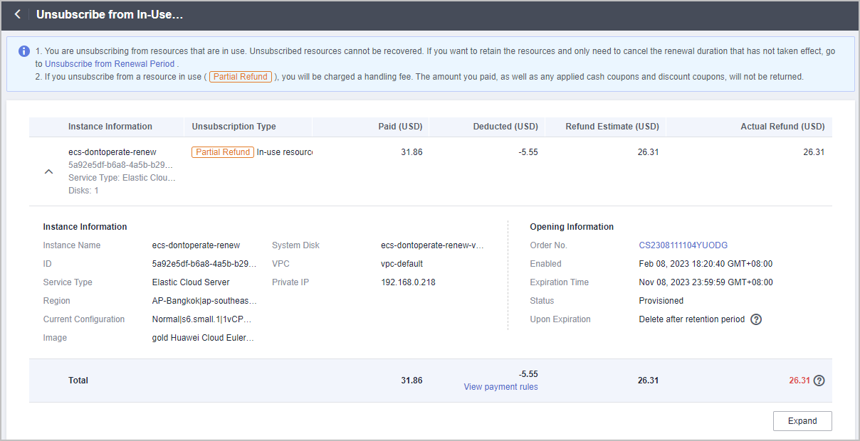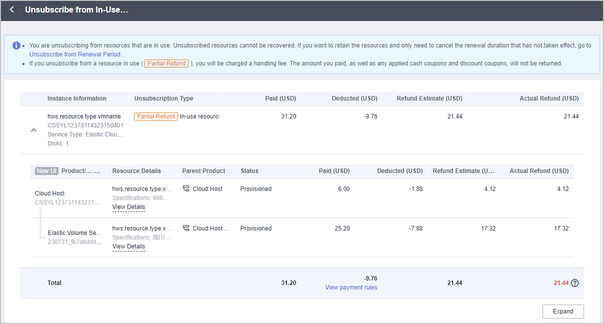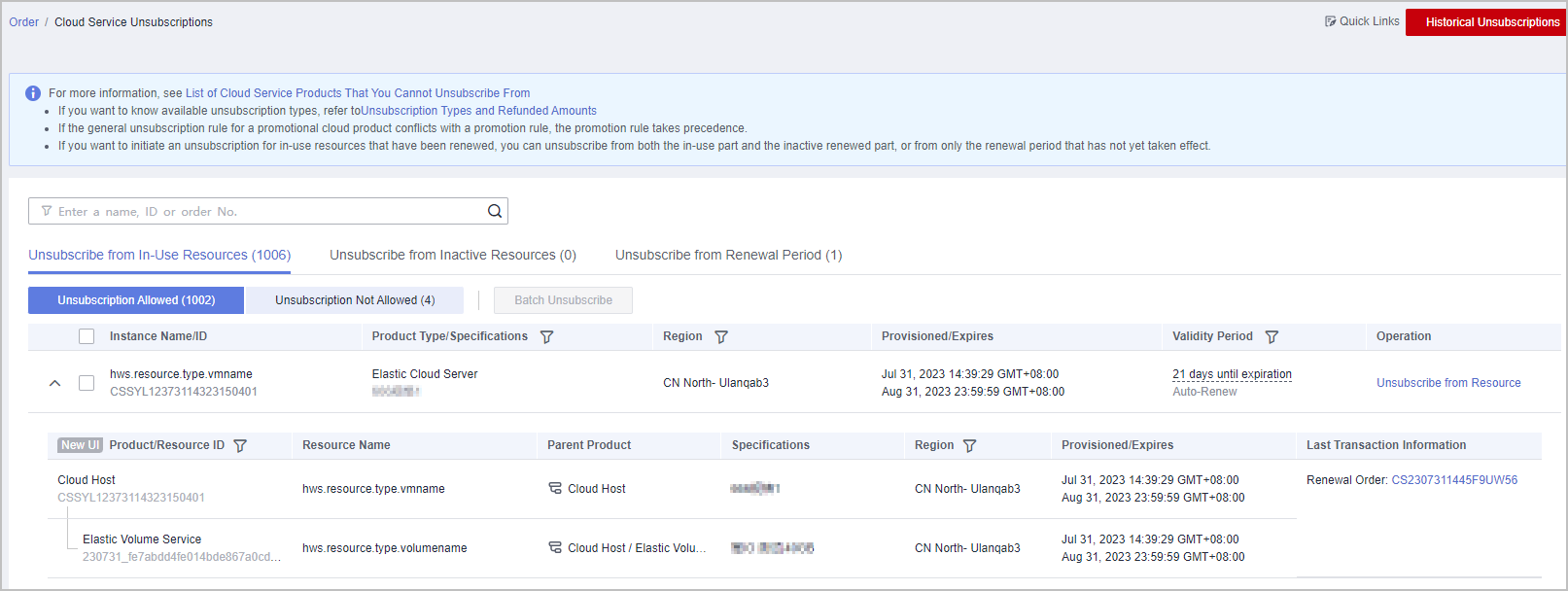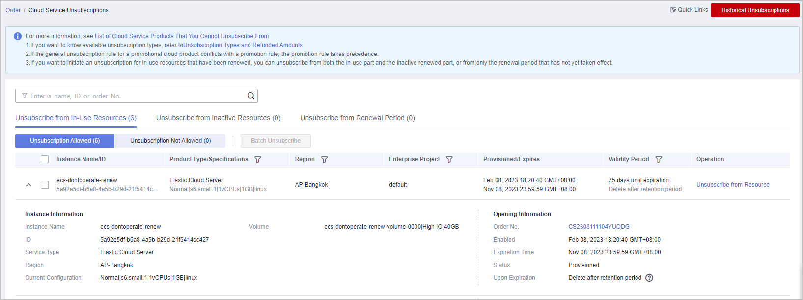 You can expand an instance to view the relationship between resources. The resources in a combined service must be unsubscribed from together.