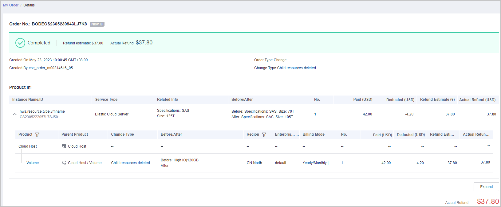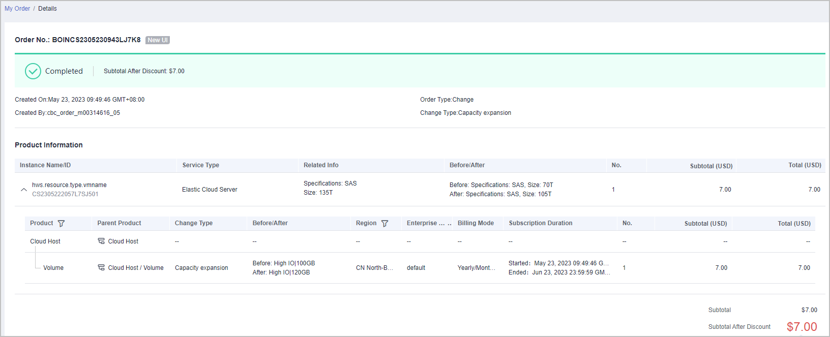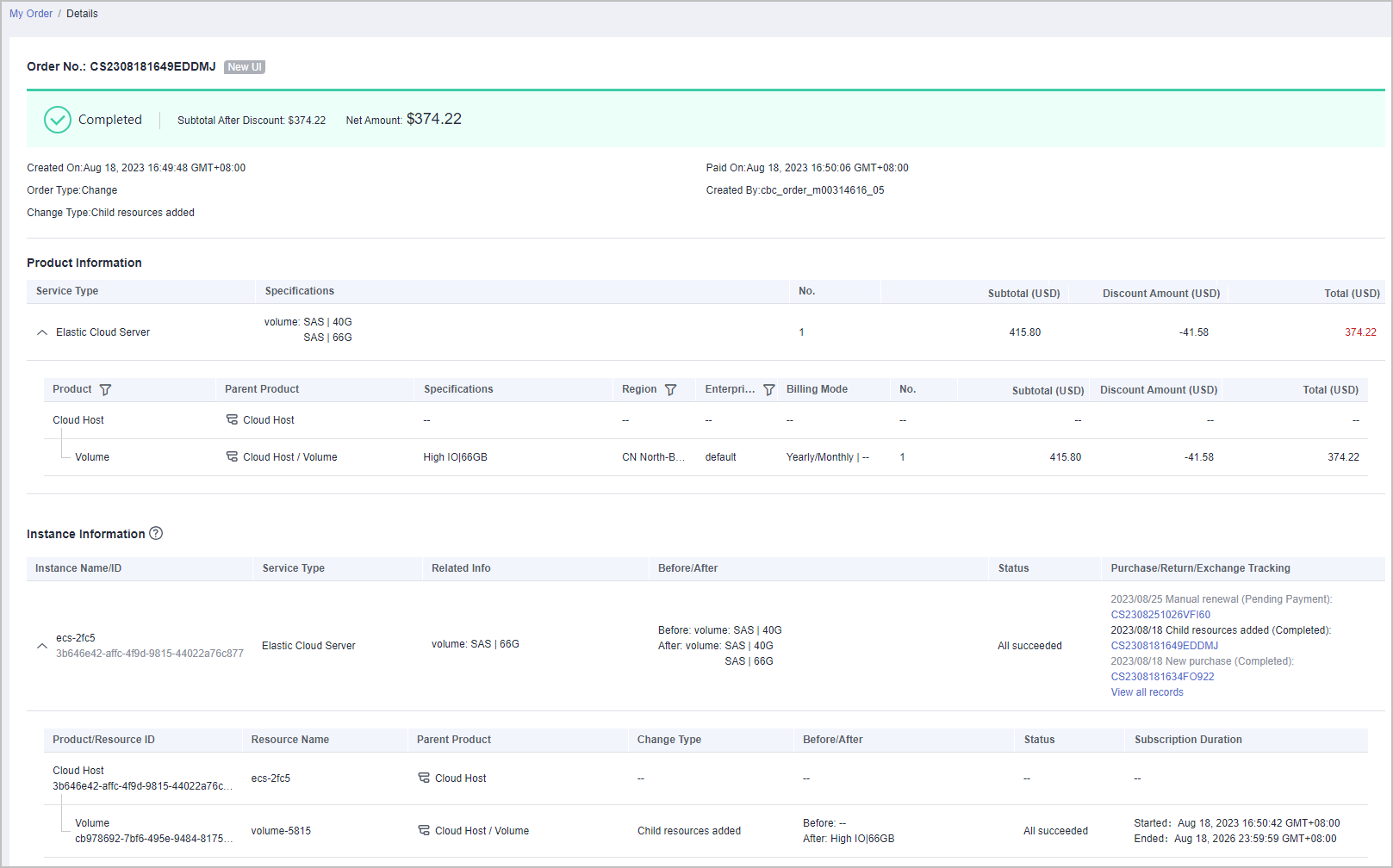 After the specifications are changed, an order with the order type Change is generated. The specific change type is displayed on the order list and order details page. The relationship of resources is displayed on the order details page.