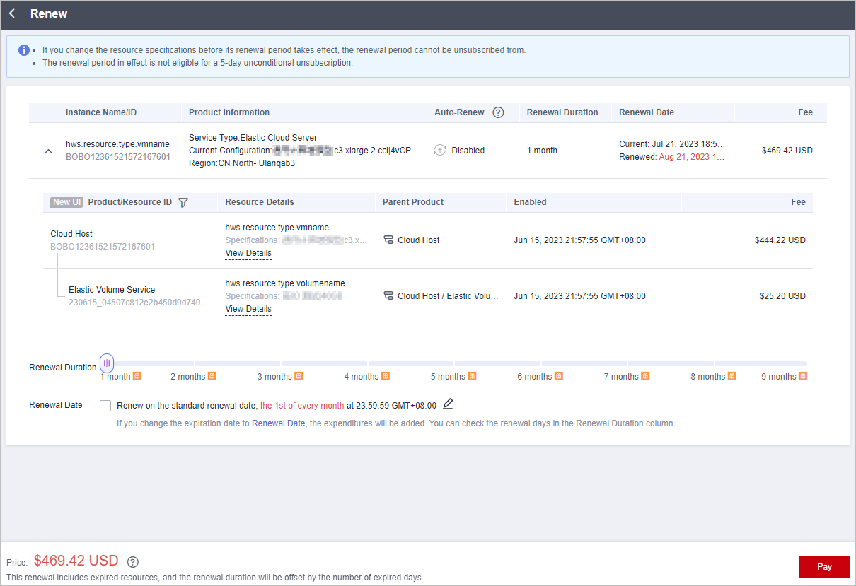 • Current order details of changing the billing mode from Pay-Per-Use to Yearly/Monthly: