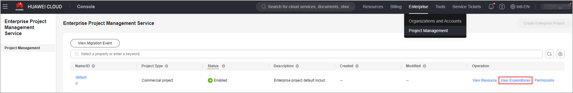 - On the Enterprise Project Management page, click View Expenditures in the Operation column of the row containing the target enterprise project.