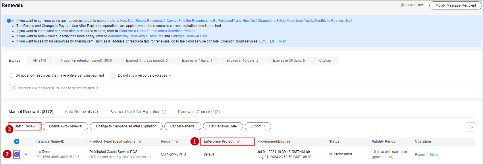 - In the navigation pane, choose Renewals. By default, all resources to be renewed in the enterprise project are displayed.