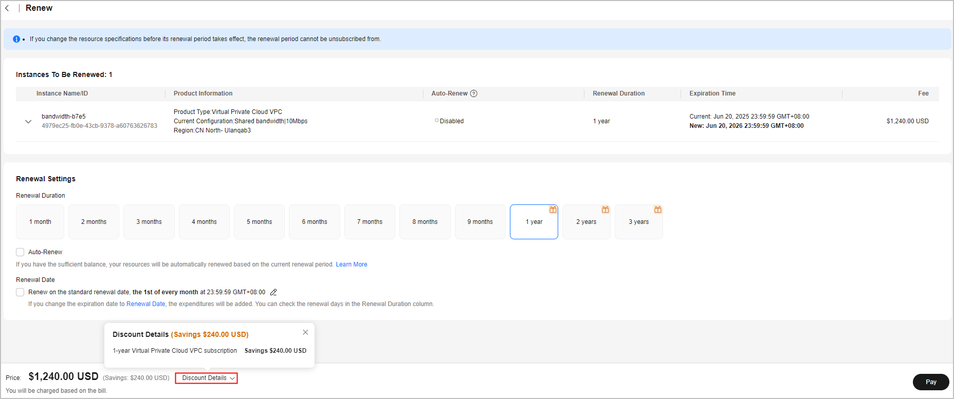 in the upper right corner of the renewal duration indicates that the renewal duration enjoys a discount. You can expand the discount details to view more. If you have a stable demand on a yearly/monthly resource, you can select a longer renewal duration to obtain the best discount.
