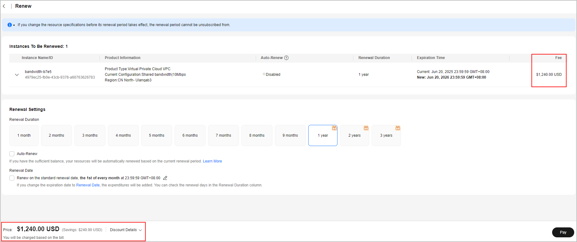After purchasing a yearly/monthly resource, you can log in to the Billing Center and open the Renewal page to view the renewal price.