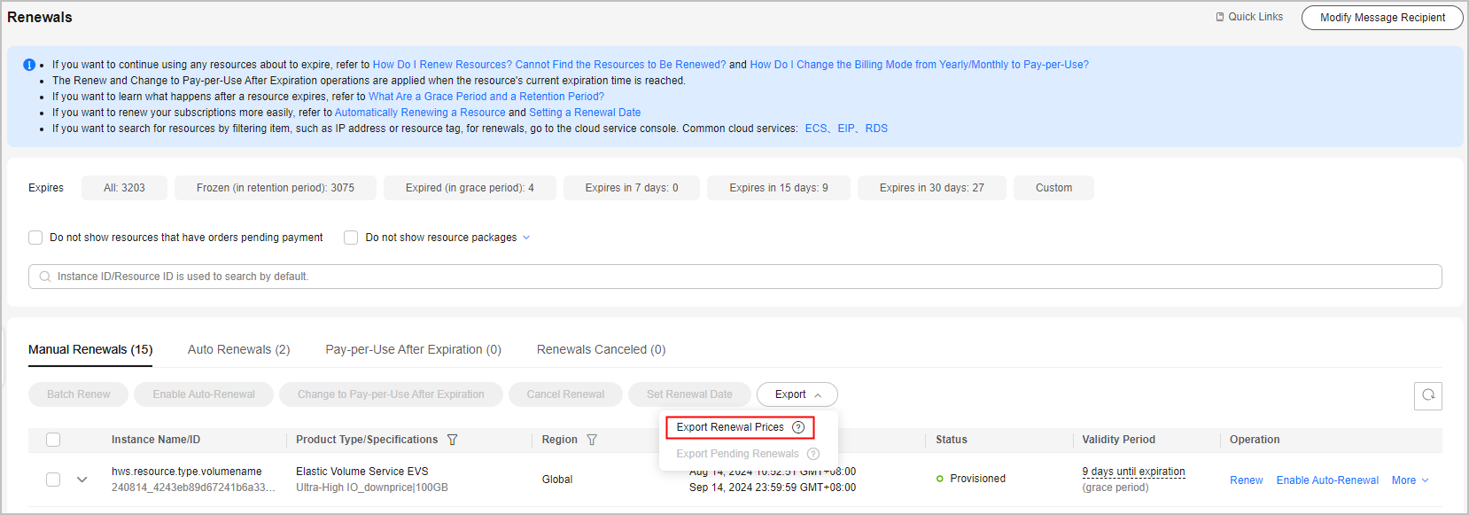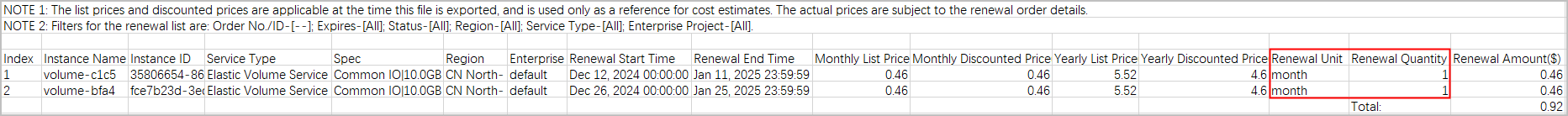- The list price, discounted price (excluding other discounts), and renewal price in the exported file are for reference only, as they are the prices when the export is operated. The actual renewal price depends on the renewal order.