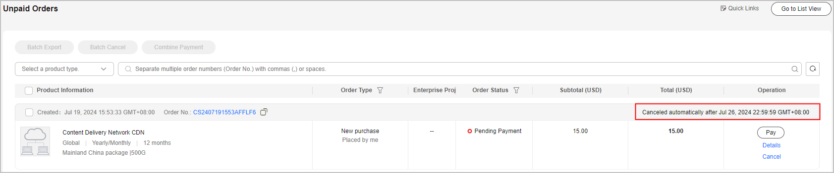 Generally, the validity period of cloud service orders to be paid is 7 days. The Unpaid Orders page presents the validity period of specific unpaid orders. You can view the validity period of your orders on the Unpaid Orders or My Orders page.