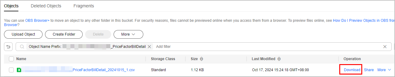 - After subscribing to detailed bills by usage type on the Billing > Data Storage page on the Billing Center, you can download and view these bills from Service List > Storage > Object Storage Service.