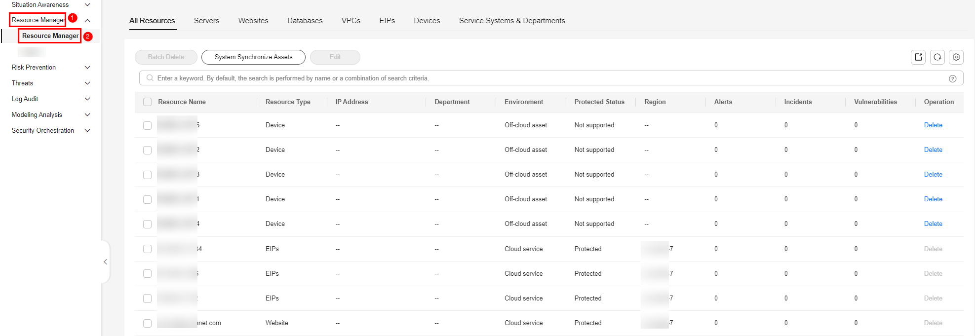 SecMaster helps you enable cross-region, cross-account, and cross-environment aggregation of assets. For assets from other environments, SecMaster will mark the environments these assets belong to. After the aggregation, SecMaster marks asset security status to show whether there are unsafe settings, OS or application vulnerabilities, suspicious intrusions, or unprotected cloud services. For example, all ECSs must be protected with HSS, and all domain names must be protected with WAF. This makes it possible for you to view security of all your assets in one place.