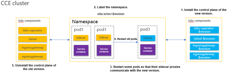 Note that when the new version is being installed, istio-ingressgateway and istio-egressgateway of the new version are also installed, and the gateways of both versions work concurrently.