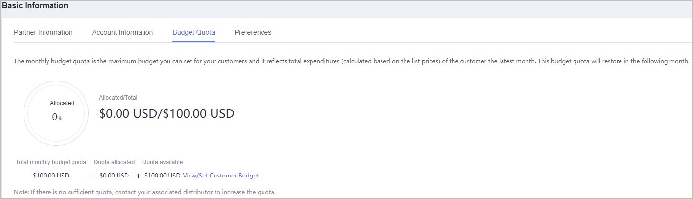 • The budget set by you for your customers cannot exceed the budget quota configured by your distributor. You can view the monthly budget granted by your distributor in Partner Center > Partner Information > Basic Information > Budget Quota.