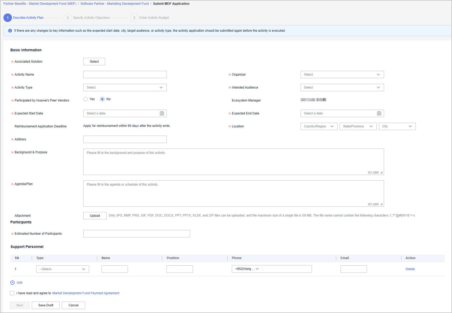 - Specify the required information of the activity plan, select I have read and agree to Market Development Fund Payment Agreement, and click Next.
