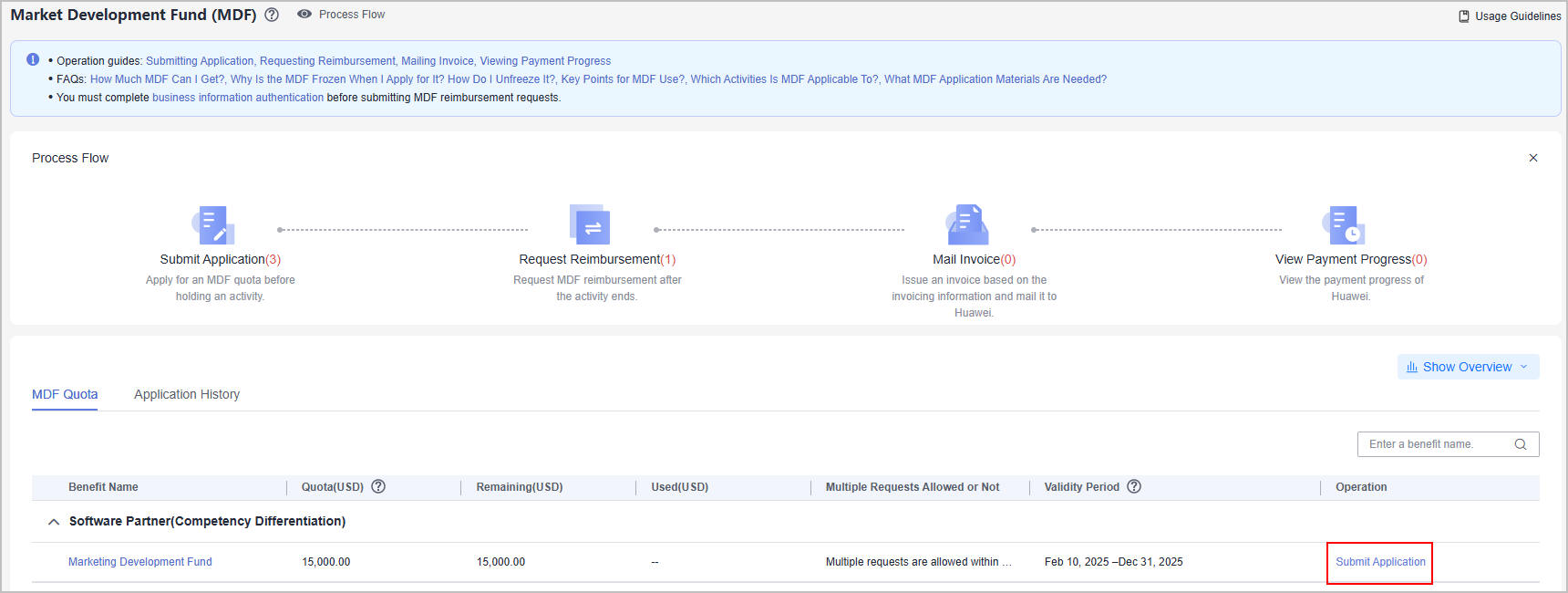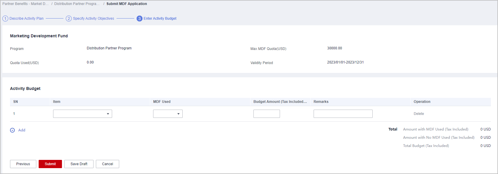 - If Amount with MDF Used (Tax Included) exceeds the MDF quota, you cannot submit the application. Contact the ecosystem manager to increase the quota and try again.