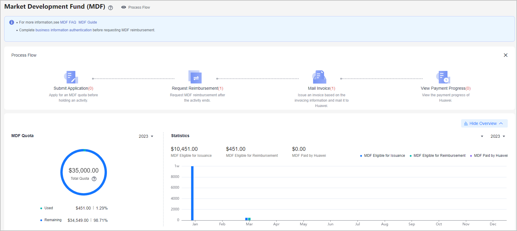 Click Show Overview on the Market Development Fund (MDF) page to view the MDF statistics of the current account.