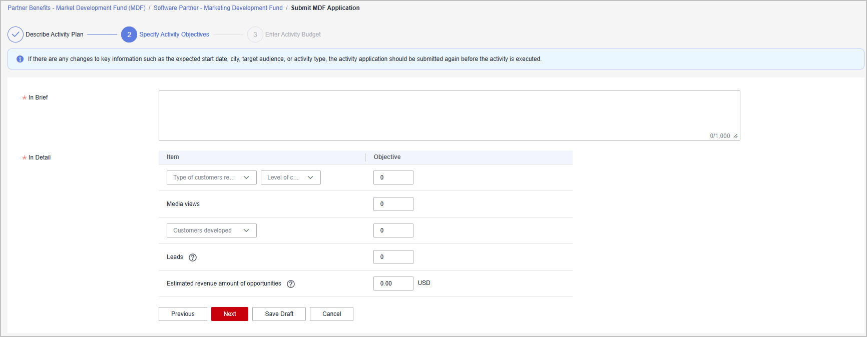- If there is any change to the key activity information including activity type, target audience, expected start date, and location, you need to re-initiate an MDF application before the actual activity.