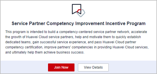 This program is intended to build a competency-centered service partner network, accelerate the growth of Huawei Cloud service partners, help and motivate them to pass Huawei Cloud partner competency certification, improve partners' competencies in providing Huawei Cloud services, and ultimately help them achieve business success.